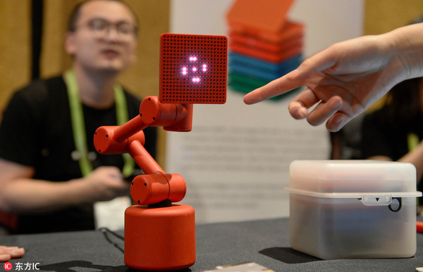 【六轴机器人】2018年1月9日,美国拉斯维加斯第51届国际消费电子展(CES)上,百度公司展出渡鸦R六轴机器人兼智能音箱。