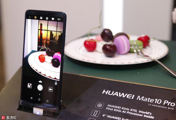 【Mate10 Pro拍照手机】2018年1月9日,美国拉斯维加斯第51届国际消费电子展(CES)上,华为展出Mate10 Pro手机。
