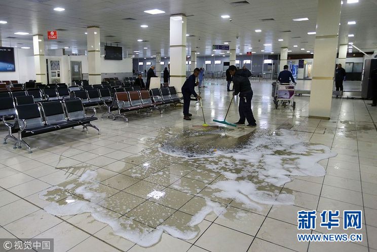 当地时间2018年1月16日,利比亚的黎波里,米提加国际机场日前遭武装袭击,民众清洗地板。据利比亚安全部门和卫生部门消息人士透露,利首都的黎波里米提加国际机场附近15日遭武装分子袭击,目前已致89人伤亡。(图片来源:视觉中国)