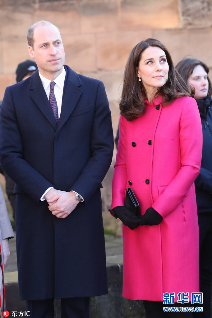 1月16日,英国西米德兰兹郡考文垂,威廉王子夫妇造访考文垂大教堂,凯特王妃一袭红色大衣挺孕肚与人群热情互动。(图片来源:东方IC)