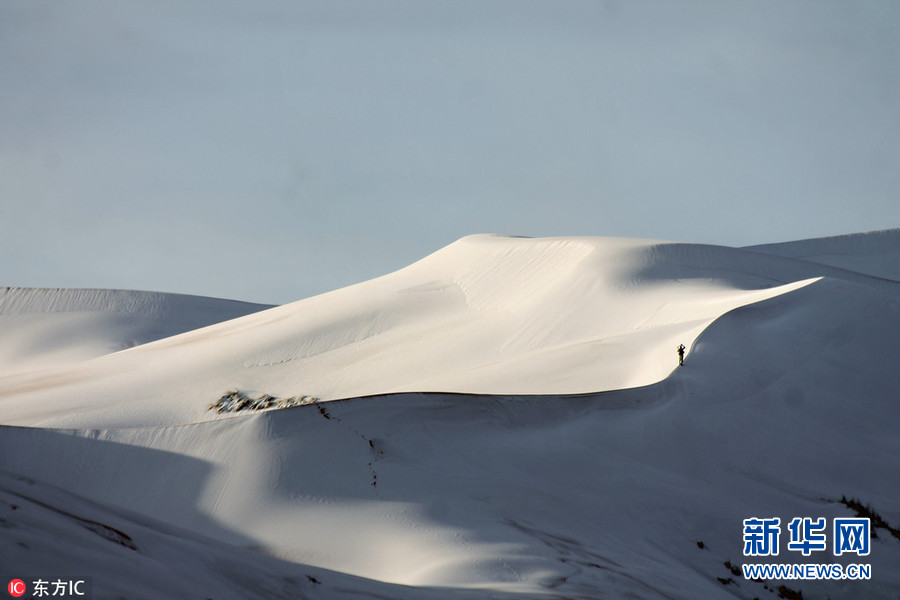 1月16日报道,7日,撒哈拉北部“门户”、阿尔及利小镇艾因塞弗拉凌晨降下近40年来第三场雪,漫漫黄沙仿佛披上了白色的外衣,白雪与黄沙交相辉映十分壮美。艾因塞弗拉堪称世界上最热的地方之一。不过,7日气温为1摄氏度,“沙漠雪景”得以保留一阵子,积雪直到下午5时左右才开始融化。摄影师卡里姆-布谢塔塔(Karim Bouchetata)十分幸运地拍到了白雪覆盖黄沙的场景,他表示,“我们实在惊讶,起床后居然还能看到雪。”艾因塞弗拉位于撒哈拉沙漠边缘与阿特拉斯山脉之间,上一次降雪是2016年12月19日,再上一次得追溯到37年前。(图片来源:东方IC)