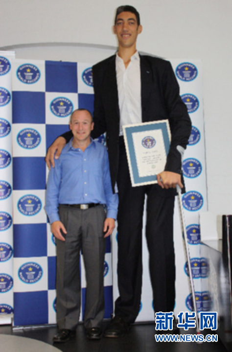 资料图片:吉尼斯世界纪录全球总裁阿里斯塔尔·理查兹(左)与“世界上最高的人(在世)”苏尔坦(土耳其籍)合影。(吉尼斯世界纪录供图)