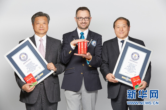 资料图片:吉尼斯世界纪录全球纪录部门资深副总裁兼中国区总经理马可(中)为《新华字典》颁发证书。(吉尼斯世界纪录供图)