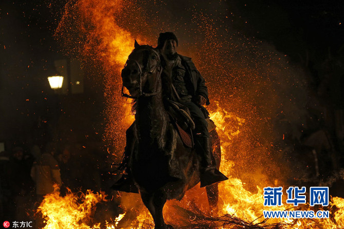 西班牙西北省庆祝传统节日 民众浴火策马为动物祈福
