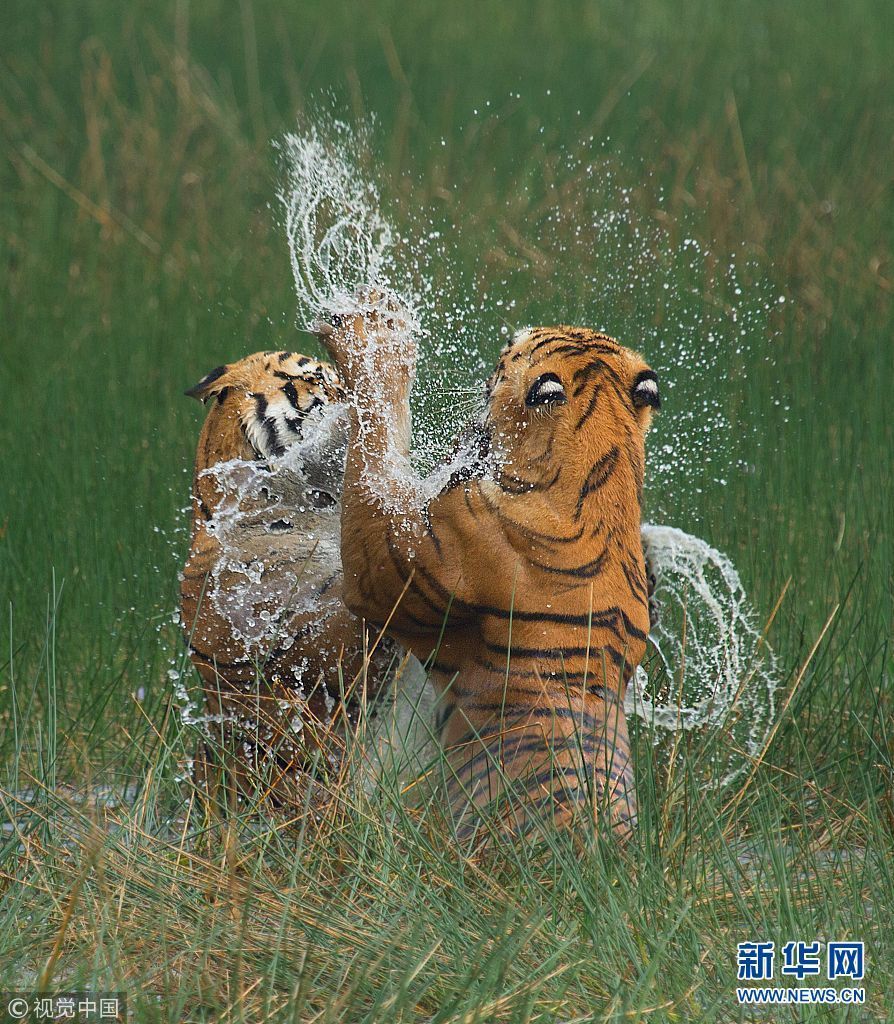 印度“虎妈”传授幼崽搏击技能 直立互搏水花四溅