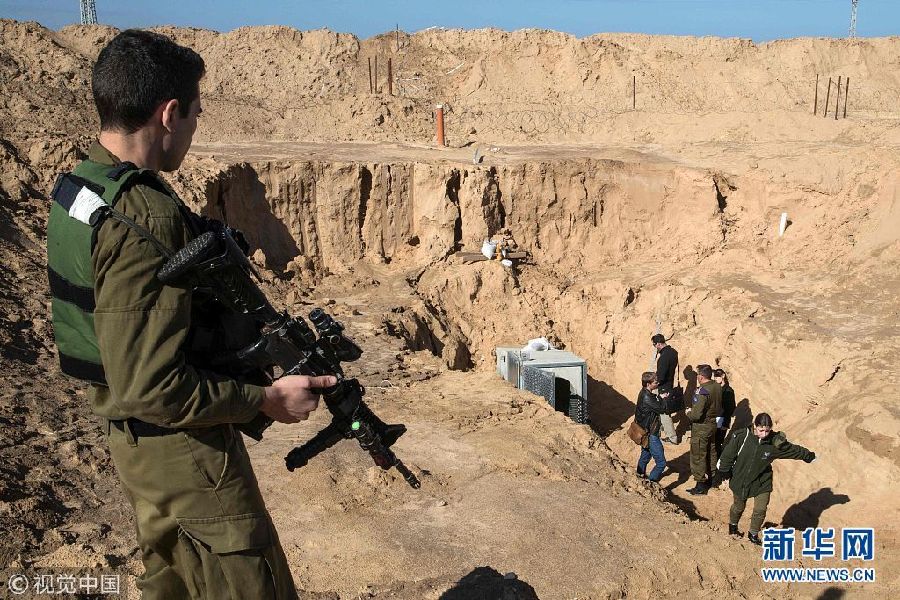 当地时间1月18日,以色列基苏菲姆,以色列军人站在巴勒斯坦武装份子挖掘的从加沙地带通往以色列境内的秘密隧道入口。以色列于10月底发现了这条隧道并将其摧毁。(图片来源:视觉中国)