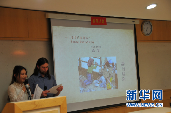 活动现场,女主持人刘津巧介绍春节的传统习俗。新华网发 刘学摄