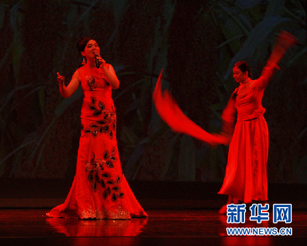 当地时间21日晚,美国得州休斯敦,休斯敦当地侨界歌手王晓芬表演女声独唱节目《九儿》。休斯敦中国人活动中心主办的这一大型春节联欢晚会,是美国休斯敦侨界的年度盛会。每年,大休斯敦地区有数十个社团、近300位演员参与春节联欢晚会。新华网发(钟佳摄)