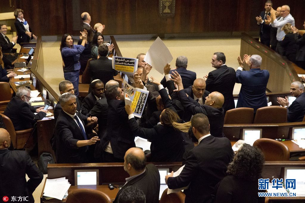 当地时间2018年1月22日,美国副总统彭斯访问以色列,在以色列议会发表演讲,遭到了以色列议会阿拉伯裔成员抗议。(图片来源:东方IC)