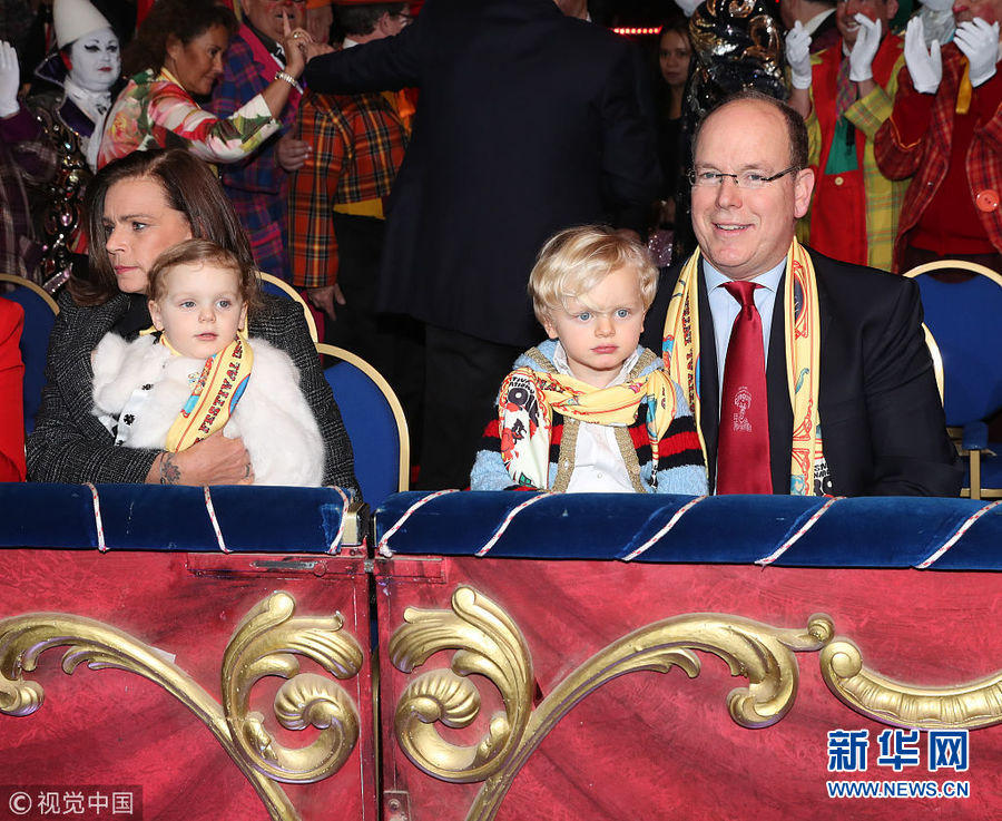 1月21日,摩纳哥,摩纳哥国王阿尔贝二世偕公主斯蒂芬妮、小王子雅克、加布里埃尔小公主等王室成员出席第42届蒙特卡罗国际杂技节。(图片来源:视觉中国)