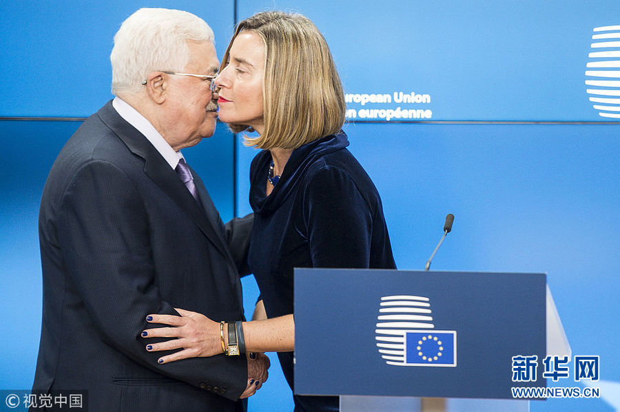 1月22日,比利时布鲁塞尔,巴勒斯坦国总统阿巴斯访问欧盟总部,会见欧盟外交和安全政策高级代表莫盖里尼。阿巴斯此行将呼吁欧盟正式承认巴勒斯坦国家。(图片来源:视觉中国)