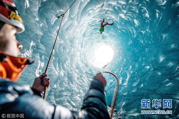 夏蒙尼是阿尔卑斯山脉的典型山城,当地一处冰川形成了多个巨大深邃的天然冰穴。两名探险者紧紧抓住钉入冰面的绳索,手握凿冰工具,一步一步蹬着垂直的冰墙从巨大冰穴向外攀爬。他们攀爬的过程被拍记录了下来。(图片来源:视觉中国)