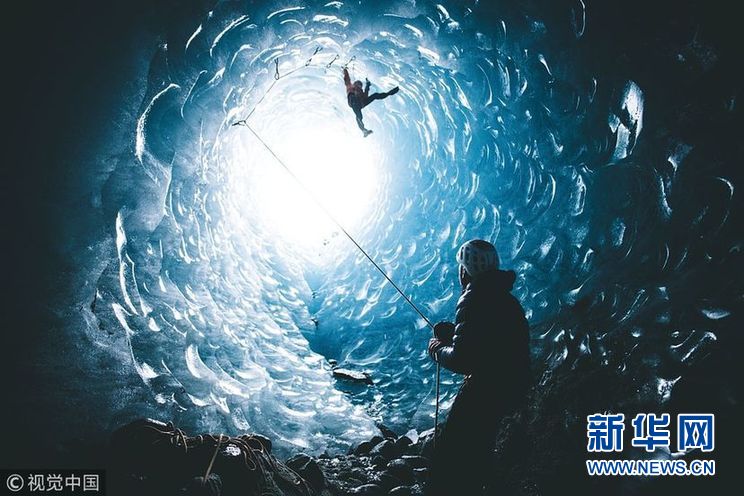 夏蒙尼是阿尔卑斯山脉的典型山城,当地一处冰川形成了多个巨大深邃的天然冰穴。两名探险者紧紧抓住钉入冰面的绳索,手握凿冰工具,一步一步蹬着垂直的冰墙从巨大冰穴向外攀爬。他们攀爬的过程被拍记录了下来。(图片来源:视觉中国)