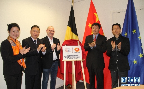 中国驻欧盟使团公使衔参赞李建民(前排左二)、中国驻比利时大使馆文化参赞向世海(前排右一)、湖南卫视国际频道总监甘霖(前排右二)和比利时法语广播电视台的特别代表(前排左三)共同为联络处揭牌。新华网发(潘革平摄)