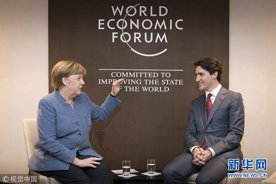 1月24日,瑞士达沃斯,德国总理默克尔出席达沃斯论坛第二天会议,与加拿大总理特鲁多举行会晤。(图片来源:视觉中国)