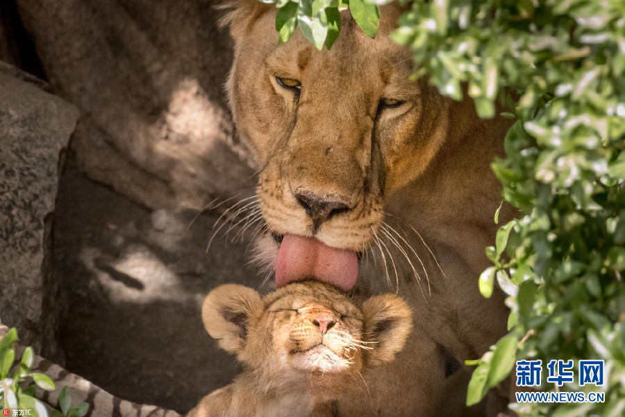 温馨!非洲母狮舔舐幼崽 获狮宝宝献吻