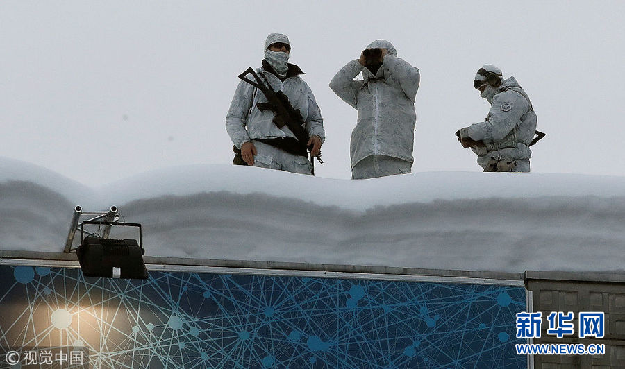 1月25日,瑞士达沃斯,美国总统特朗普出席达沃斯论坛期间,狙击手和守卫在特朗普下榻的酒店屋顶站岗。(图片来源:视觉中国)