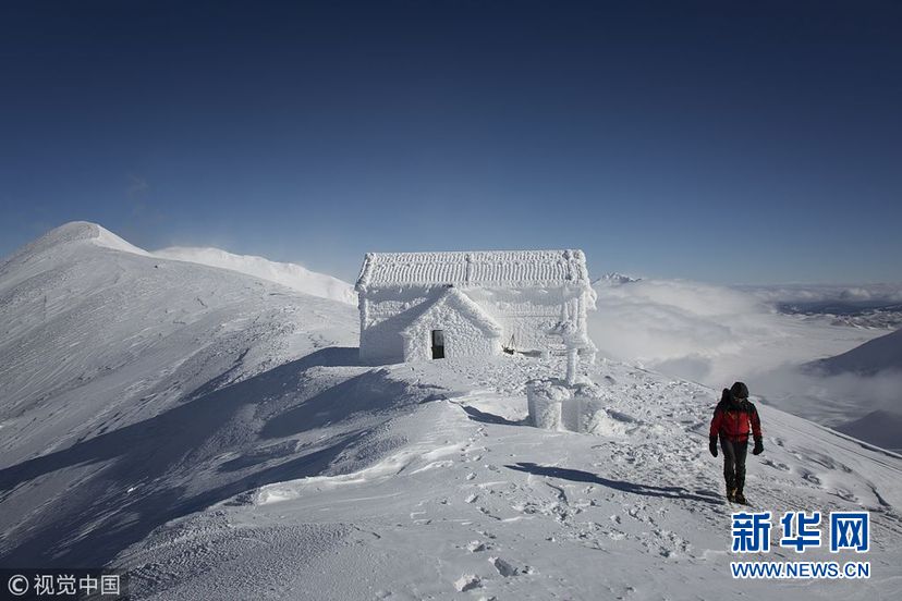 2018年1月30日讯(具体拍摄时间不详),意大利阿布鲁佐地区,位于阿尔卑斯山脉的一座山峰上的一座小木屋由于猛烈的暴风雪和接近零下15摄氏度的气温,被冰雪完全覆盖住,当地的风速甚至达到了可怕的80千米每小时,积雪的厚度足足有3英尺那么厚(约0.91米)。(图片来源:视觉中国)