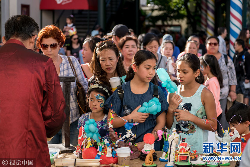 当地时间1月28日,美国洛杉矶,当地Grove商场举行少林武术表演以及其他中国文化类的演出,庆祝传统新年,场外摊位还有传统剪纸,捏面人,糖画,彩绘等项目。图为捏面人。(图片来源:视觉中国)