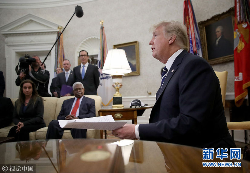 美国总统特朗普与公司职员讨论税改 获赠一双花袜子