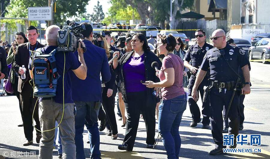 2月1日,美国洛杉矶,洛杉矶萨斯卡斯特罗(Sal Castro)中学发生枪击案,已致2名学生送医,且伤情不明。警方表示,现场情况已经得到控制,开枪的女学生已被羁押。但警方并未透露该学生的年龄和姓名。(图片来源:视觉中国)