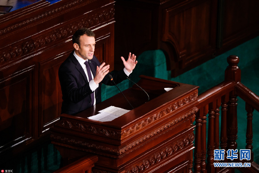 当地时间2月1日,突尼斯首都突尼斯,法国总统马克龙对突尼斯进行国事访问并发表演讲。(图片来源:东方IC)