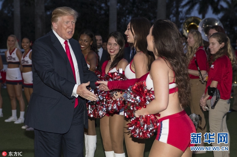 当地时间2018年2月4日,美国佛州西棕榈滩,美国总统特朗普与第一夫人梅拉尼娅在高尔夫俱乐部观看大学生乐队的欢迎演出,与美女啦啦队员握手。据悉,特朗普夫妇出席在该俱乐部举办的超级碗派对。(图片来源:东方IC)