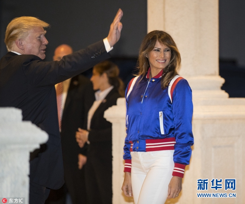 当地时间2018年2月4日,美国佛州西棕榈滩,美国总统特朗普与第一夫人梅拉尼娅在高尔夫俱乐部观看大学生乐队的欢迎演出,与美女啦啦队员握手。据悉,特朗普夫妇出席在该俱乐部举办的超级碗派对。(图片来源:东方IC)