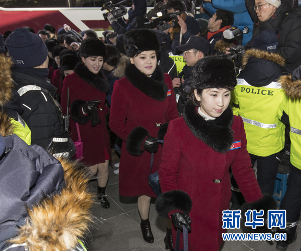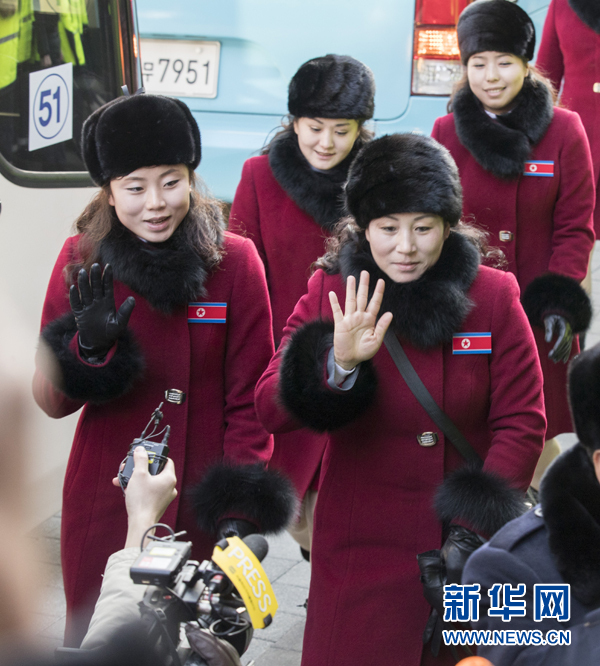 2月7日,朝鲜拉拉队成员乘车到达韩国江原道麟蹄郡。当日,参加平昌冬奥会的朝鲜拉拉队、跆拳道示范团、记者团和民族奥林匹克委员会官员等一行280人经由京义线陆路抵达韩国境内。新华社发(李相浩摄)
