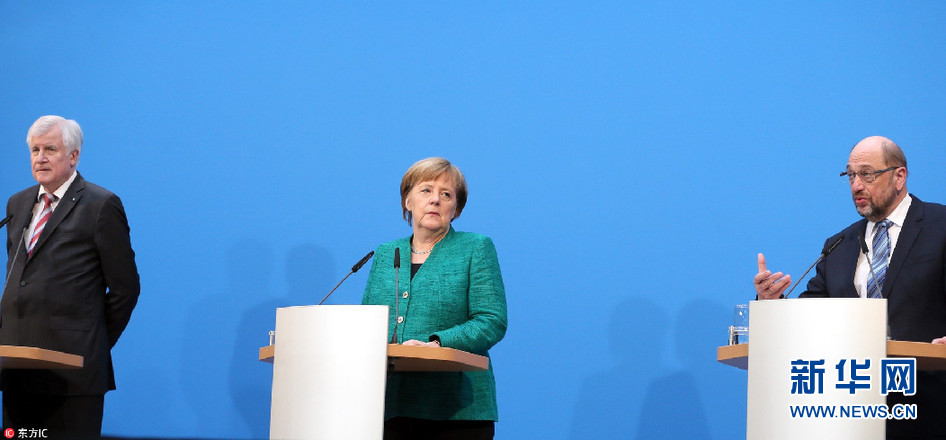 当地时间2018年2月7日,德国柏林,德国总理、基民盟主席默克尔、社民党主席舒尔茨以及基社盟主席霍斯特-泽霍夫出席联合新闻发布会。据报道,默克尔领导的联盟党(基民盟与基社盟)与舒尔茨领导的社民党就组阁谈判达成了一致。(图片来源:东方IC)