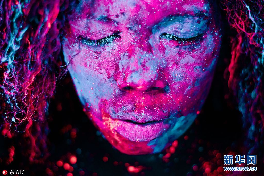 2018年2月9日报道,巴西摄影师Hid Said用荧光颜料涂在模特的面部,再通过光的照射,映出发着霓虹光的人脸肖像,令人震撼。(图片来源:东方IC)