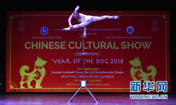 2月9日,在印度首都新德里,2018“欢乐春节”活动演出现场,中国演员在表演杂技。新华网发(张迺杰摄)