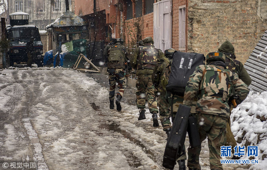 2月12日,印控克什米尔斯利那加,印度政府军与疑似激进分子展开枪战。两名持枪歹徒在他们的营地附近开火致一名印度准军事部队士兵死亡。(图片来源:视觉中国)