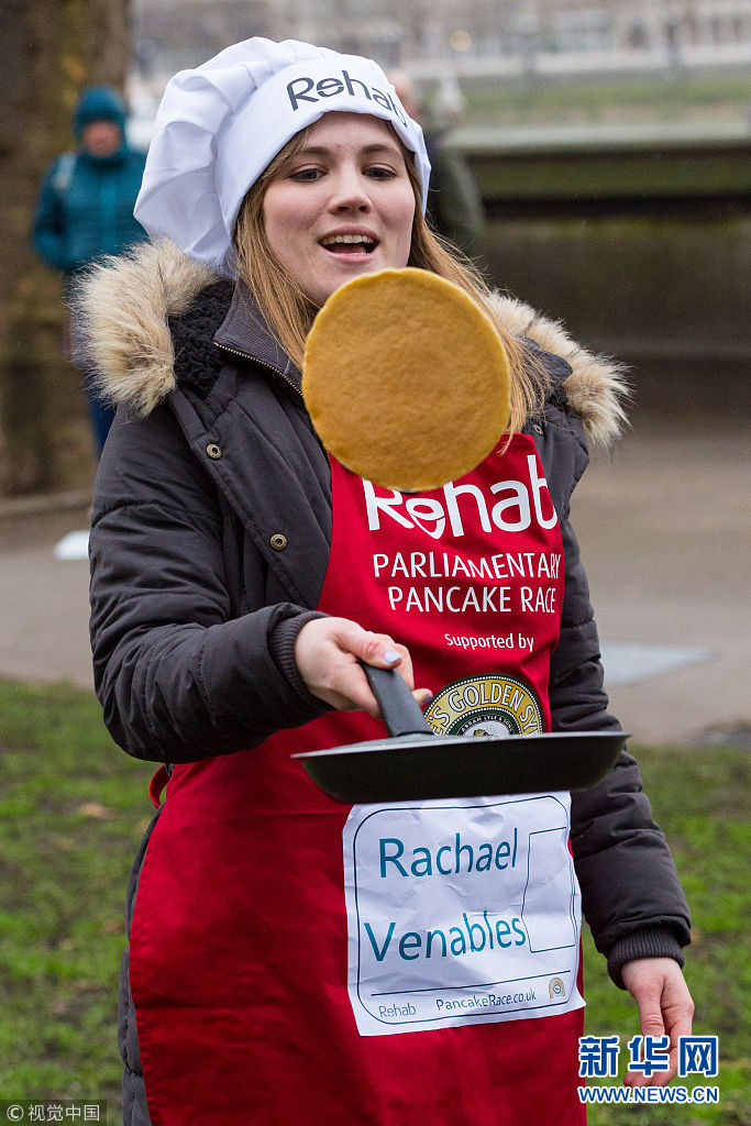 2月13日,英国伦敦,当地举行颠煎饼跑比赛,市民手持平底锅赛跑比速度。(图片来源:视觉中国)