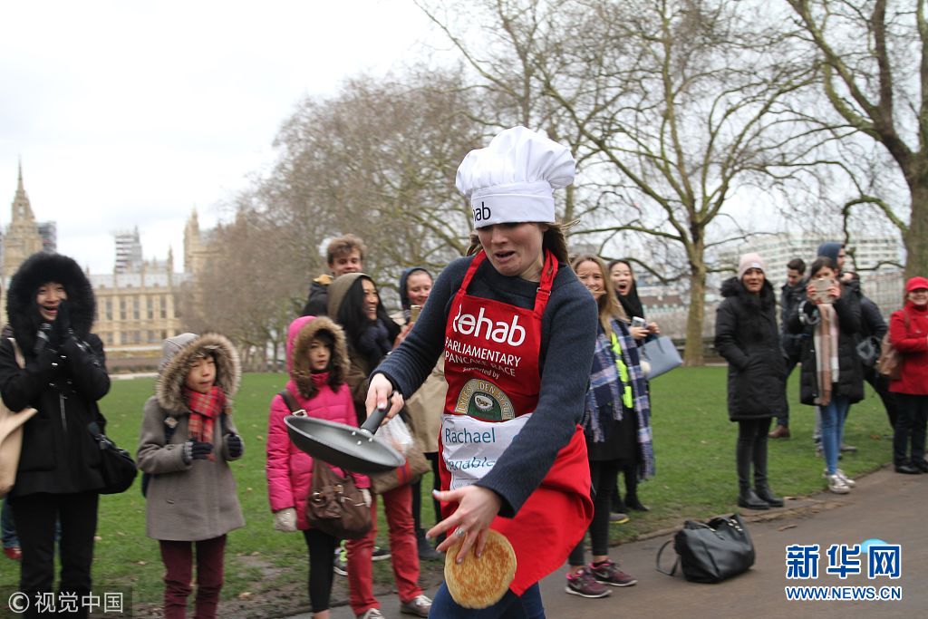 2月13日,英国伦敦,当地举行颠煎饼跑比赛,市民手持平底锅赛跑比速度。(图片来源:视觉中国)