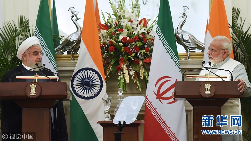 当地时间2018年2月17日,印度新德里,印度总理莫迪会见伊朗总统鲁哈尼。(图片来源:视觉中国)