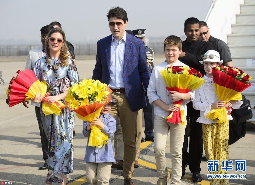 特鲁多偕妻儿访印 泰姬陵前照全家福温馨有爱