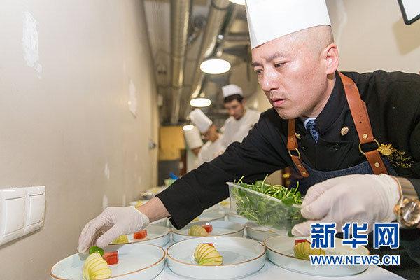 2月19日,在俄罗斯首都莫斯科,中方厨师为菜品摆盘。新华社记者 白雪骐 摄
