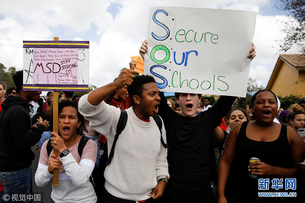 当地时间2月21日,美国佛罗里达州,学生游行示威,呼吁控枪。美国佛州致17人死亡的校园枪击案发生一周后,全国多所学校师生罢课声援。 (图片来源:视觉中国)