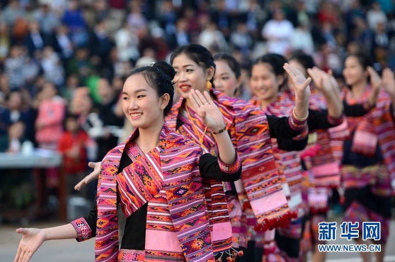2月17日,沙耶武里(老挝),在老挝沙耶武里大象节上,身着传统服装的老挝女孩在表演舞蹈。刘艾伦摄 新华网发
