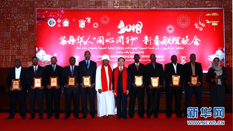 中国驻苏丹大使李连和、苏丹总统助理贾兹与中国石油苏丹杰出雇员和优秀雇员代表合影。新华网发
