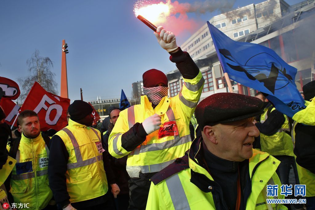 当地时间2018年2月22日,法国巴黎,法国航空公司员工在戴高乐机场附近举行罢工游行,要求工资增长6%。罢工导致法航当天50%的远途航班被取消。(图片来源:东方IC)