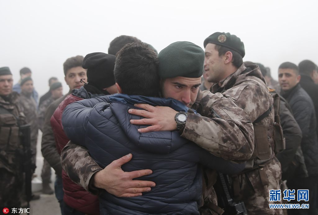 当地时间2018年2月22日,土耳其哈塔伊,2组共44名特别行动警察参加送别仪式和亲人惜别,他们将前往叙利亚阿夫林地区参与“橄榄枝行动”。(图片来源:东方IC)
