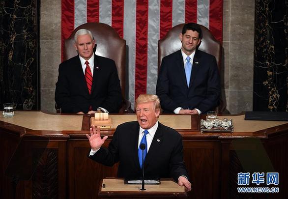 1月30日,美国总统特朗普(前)在华盛顿国会山发表其执政以来的首次国情咨文演讲。新华社记者 殷博古 摄