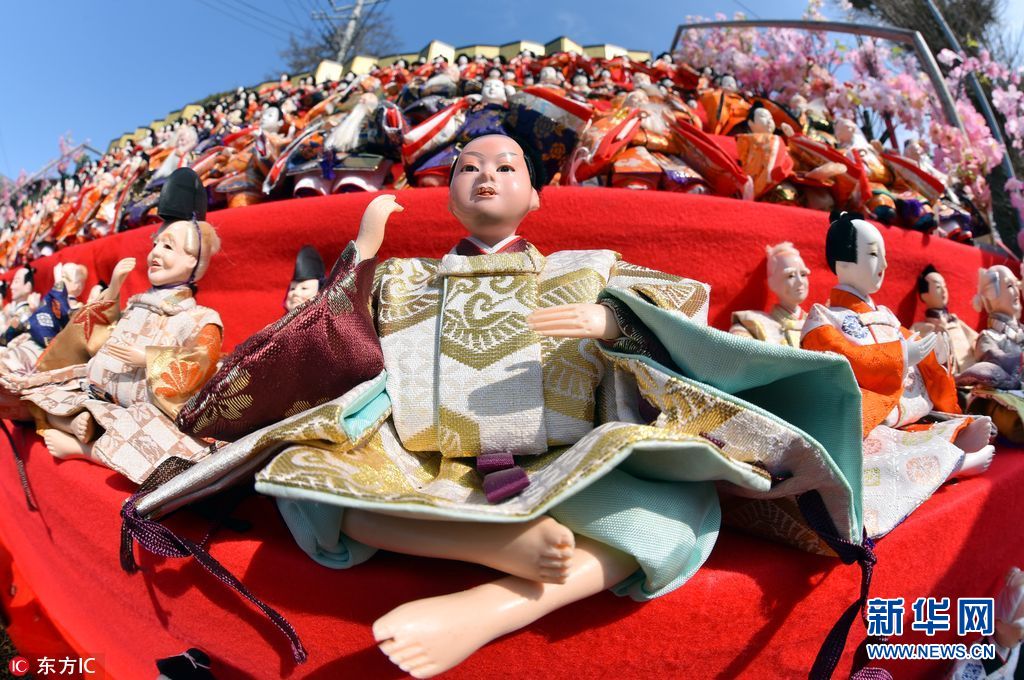 当地时间2018年2月23日,日本胜浦市,远见岬神社的60级石阶上装饰着约1800个娃娃,迎接女儿节。每年3月3日是日本传统的女儿节,又称人偶节,父母通常会把人偶娃娃装饰在家门口,为女儿祈福。日本千叶县的胜浦市每年都会举办大型人偶节,节日期间,当地市艺术和文化中心会展出6000个人偶。(图片来源:东方IC)