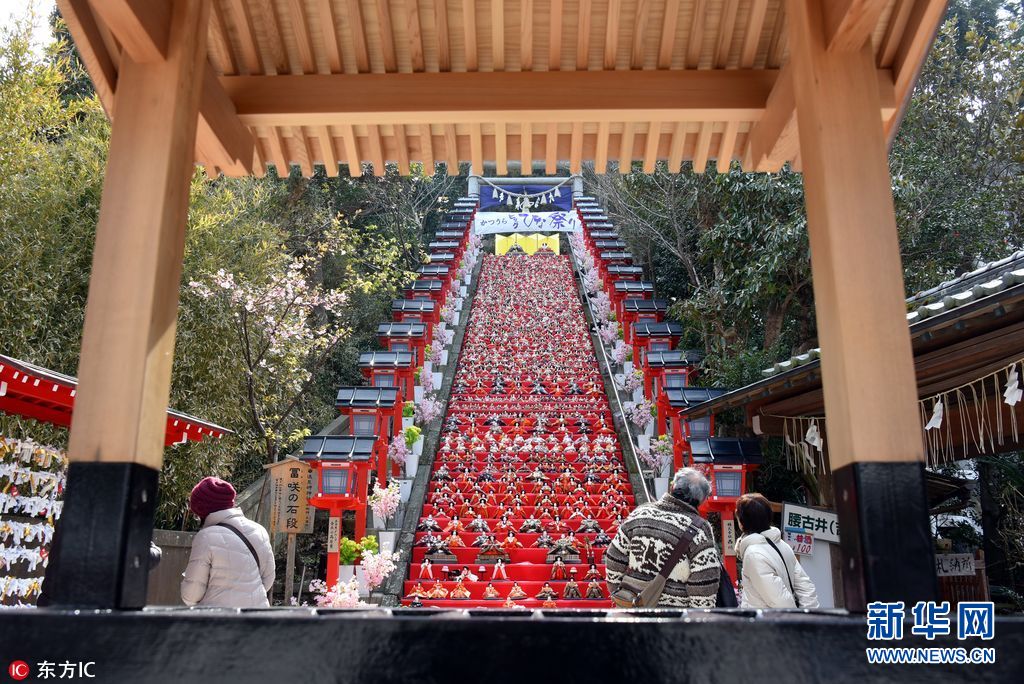 当地时间2018年2月23日,日本胜浦市,远见岬神社的60级石阶上装饰着约1800个娃娃,迎接女儿节。每年3月3日是日本传统的女儿节,又称人偶节,父母通常会把人偶娃娃装饰在家门口,为女儿祈福。日本千叶县的胜浦市每年都会举办大型人偶节,节日期间,当地市艺术和文化中心会展出6000个人偶。(图片来源:东方IC)