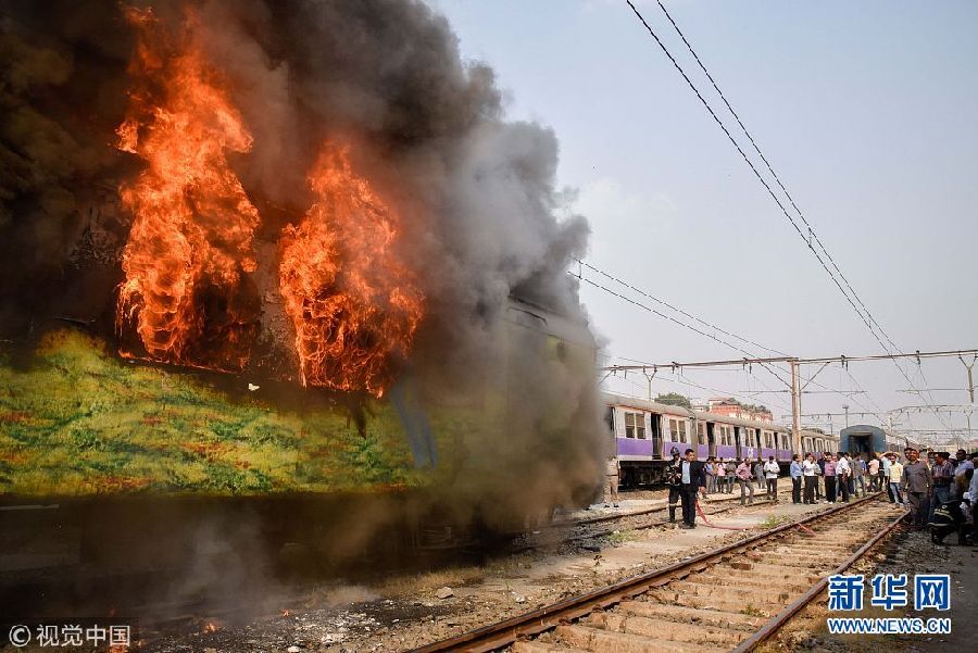 当地时间2月23日,印度普纳,当地一辆停着的火车空车厢着火,消防队员及时到达扑灭火灾,据称车厢因短路着火,没有人员伤亡报告。(图片来源:视觉中国)