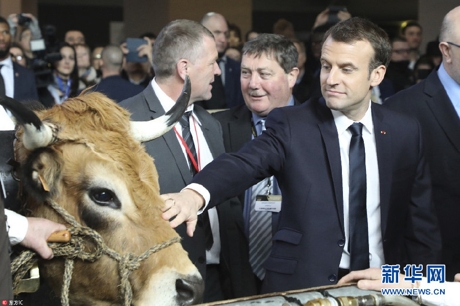 当地时间2月24日,法国巴黎,法国总统马克龙参观第55届国际农业博览会,在会场与参展人员交流,抚摸小牛。(图片来源:东方IC)