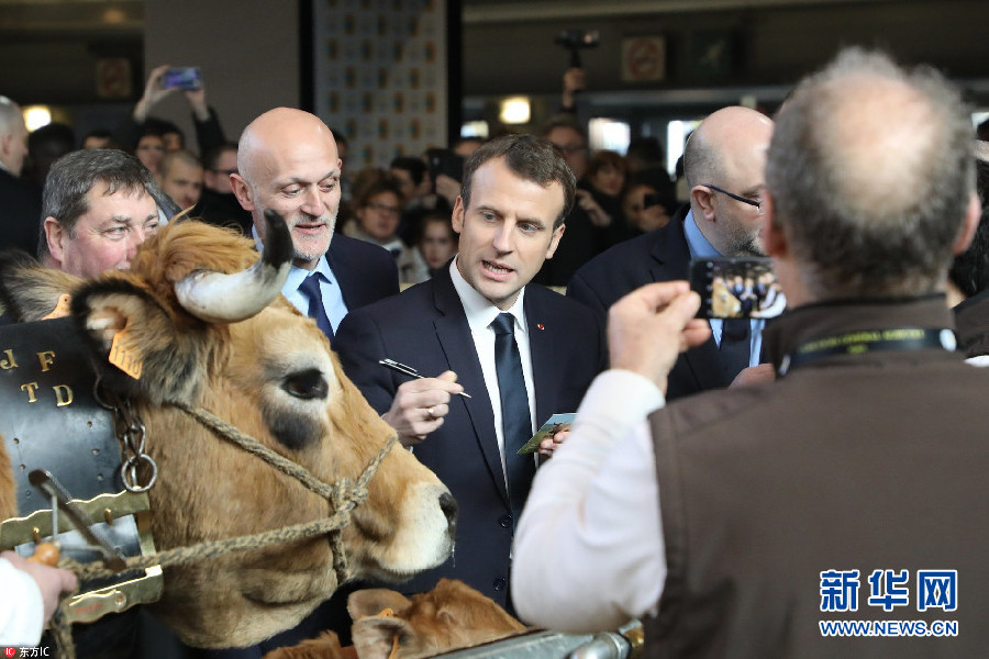 马克龙参观巴黎国际农博会 与展牛互动