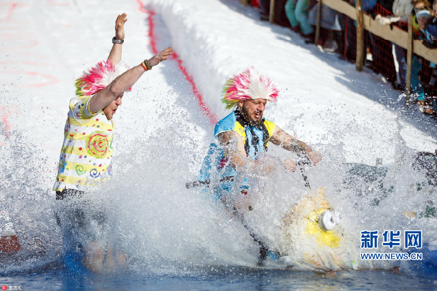 当地时间2月24日,瑞士尧恩,当地举办冰雪滑道大赛,选手们乘雪橇从滑雪斜坡上飞驰而下,冲进斜坡上开凿的水池滑行,滑行最远的选手即可获胜。